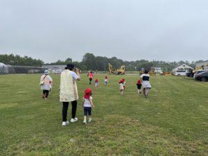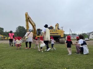 その後はグラウンドを一生懸命走って、停めてある重機の前で記念撮影してお散歩に戻っていきました。