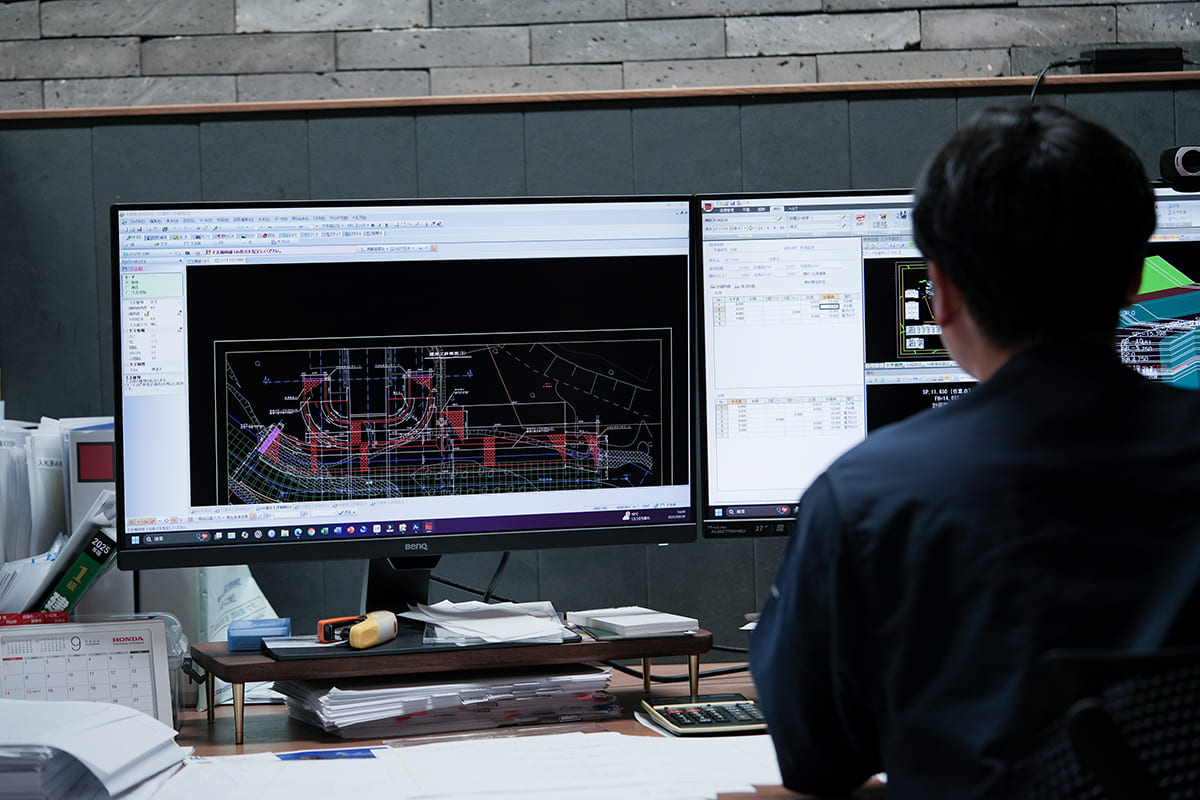 大規模工事に欠かせない施工管理や生産性向上のため、ドローンによる高精度な3次元測量、得られたデータを用いた設計・施工計画、そしてICT建設機械による精密な施工へと、工程のすべてをデジタルでつないでいます。さらに、検査の省力化や維持管理までICTを活用し、現場の判断をより正確に、より安全に導く仕組みづくりを進めています。